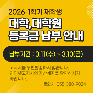 재학생 대학생활에 필요한 정보들을 제공합니다. 예비신입생 예비신입생에게 와이즈유를 소개합니다. 교직원&동문 와이즈유의 다양한 소식들을 전달합니다. WHO?자랑스런 와이즈유 OPEN CAMPUS오픈캠퍼스 YES21교직원 그룹웨어 WISEU TIMES와이즈유 타임즈 재학생 Mypage 학사정보시스템 YCMP(취업·비교과) 학사일정 등록금납부 수업 학적 학사서식 증명서발급 졸업인증제 e-class 교수학습개발원 도서관 스쿨버스 학생생활관 (기숙사) 교내식당 주간메뉴 국제교류 학생활동 풋살경기장 잔디운동장 창의설계실 생활정보 캠퍼스맵 양성평등상담실 장학 학습지원 메타버스 예비신입생 입학안내 대학소개 학과소개 언론홍보 내인생의스승 자랑스런 와이즈유인 오시는길 학생생활관 (기숙사) e-class 지원자조회 수강신청 교과목보기 메타버스 교직원&동문 YES21 교직원정보시스템 공지사항 학사일정 e-class 도서관 교수학습개발원 대학이미지(UI) 전화번호검색 캠퍼스맵(강의실검색) 증명서발급 메타버스 닫기 1 / 정지 재생 지금 와이즈유? 보도자료 IPP사업단, ‘일학습병행 외부평가’ 10명 합격 2026-03-18 보도자료 부산RISE사업단, AWS와 손잡고 AI영상제작 인재 양성 2026-03-17 보도자료 K-푸드 최영호 교수, 원동매화축제서 미나리 요리 시연 2026-03-16 보도자료 제4회 대학혁신포럼...AI 기반 미래교육 청사진 제시 2026-03-13 보도자료 한국어교육센터, ‘한국어 교원 3급 양성과정’ 운영기관 선정 2026-03-12 보도자료 사회복지학과 졸업생, ‘아마존웹서비스 해커톤’ 우수상 2026-03-11 보도자료 [포토] 신임 보직교원 임명장 수여식 2026-03-11 보도자료 “신입생의 설렘과 재학생의 꿈을 응원해!” 2026-03-10 이달의 와이즈유 03.03 1학기 최종 수강신청 정정 및 철회기간 03.03 1학기 개강 04.06 1학기 중간 강의평가 기간 04.06 수업일수 1/3선(자퇴자 등록금 5/6 환불 마감일) -일반휴학자 등록금 대치 마감일 04.07 1학기 중간고사 시간표 공고 04.13 하계 계절학기 개설희망교과목 신청기간 04.21 1학기 중간고사 기간 05.01 수업일수 60일(자퇴자 및 일반휴학자 등록금 2/3 환불 마감일) 정지 재생 학사일정 더보기 와이즈유 공지사항 와이즈유 새소식 전체 전체 더보기 학사 학사 더보기 장학 장학 더보기 등록 등록 더보기 취업 취업 더보기 일반 일반 더보기 사회봉사 사회봉사 더보기 바로가기 학사정보시스템 교내식당 스쿨버스 YCMP e-class 증명서발급 수업 학사Q/A 도서관 다양한 소식을 SNS을 통해 알립니다. 영산대학교 페이스북 바로가기 영산대학교 유튜브 바로가기 영산대학교 카카오채널 바로가기 영산대학교 블로그 바로가기 영산대학교 인스타그램 바로가기 영산대 “영심비 와이즈유 페스티벌” 와이즈유 영산대학교 K-MOVE 2개 운영 사업 선정 와이즈유 영산대학교 조리예술학과 김수현 학생, 산업인력공단 이사장상 수상 와이즈유 영산대학교 조리예술학과 김수현 학생, 산업인력공단 이사장상 수상 정지 재생 MICE특성화 해운대캠퍼스Haeundae Campus 관광문화예술대학 호텔관광학과 항공관광학과 관광컨벤션학과 레저스포츠관광학과 조리예술학부 K-Food조리전공 동양조리전공 서양조리전공 Bakery&Beverage전공 글로벌조리전공 미용예술학과 디자인학부 패션디자인전공 인테리어·도예디자인전공 연기공연미디어학부 연기공연예술전공 방송사진미디어전공 K-Pop전공 웹툰학과 게임VR학과 만화애니메이션학과 AI그래픽학과 시니어모델학과 웰니스보건대학 물류경영학과 글로벌학부 한ㆍ베트남통역전공 K-비즈니스전공 비즈니스법전공 미래융합대학 부동산학과 사회복지학과 헬스케어학과 아동·가족상담학과 미용건강관리학과 웰빙조리창업학과 실버재활학과 웰니스특성화 양산캠퍼스Yangsan Campus 웰니스보건대학 간호학과 물리치료학과 치위생학과 태권도학과 동양무예학과 경찰행정학과 융합전공학부 동양상담복지학과 한국어문화교육학과 기계ㆍ자동차공학과 수소시스템공학과 전기전자공학과 건축공학과 컴퓨터공학과 드론공간정보공학과 미래융합대학 인문문화융합학과 노인복지상담학과 성심교양대학 자기설계전공학부